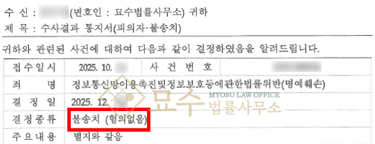 묘수 법률사무소는 최근 아티스트 김재중 팬덤의 고발로 수사기관에서 피의자로 특정된 의뢰인을 경찰 단계에서부터 변호하여, 최종적으로 무혐의(불송치) 처분을 이끌어냈습니다.